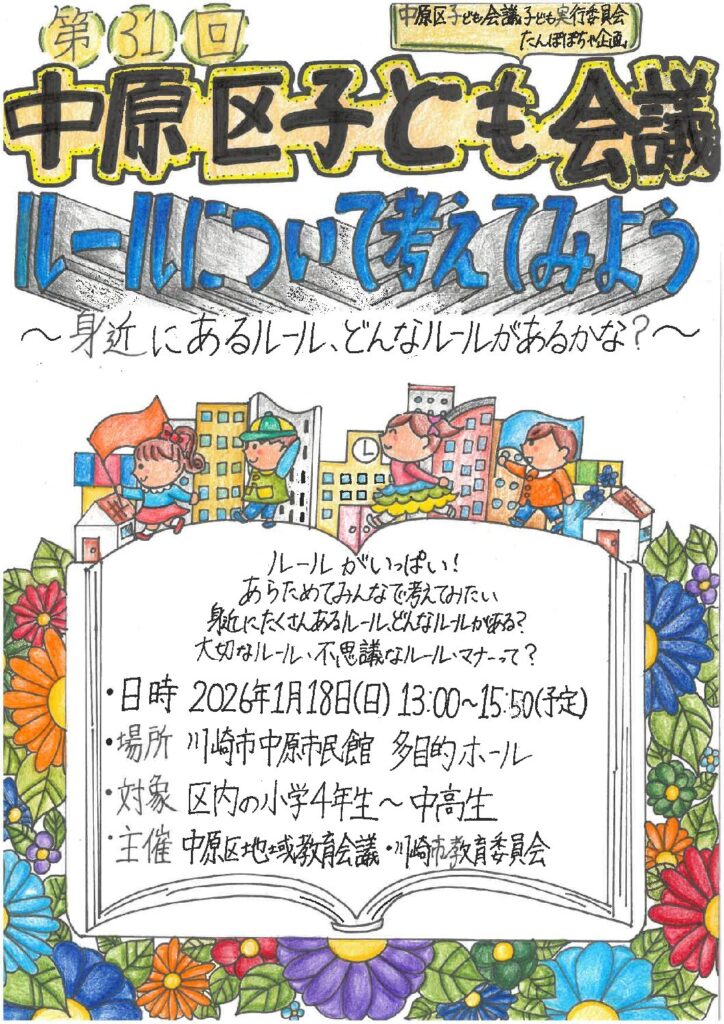中原区子ども会議は、区内の小学校4年生から高等学校3年生が参加対象となります。ぜひお友だちを誘ってきてください。